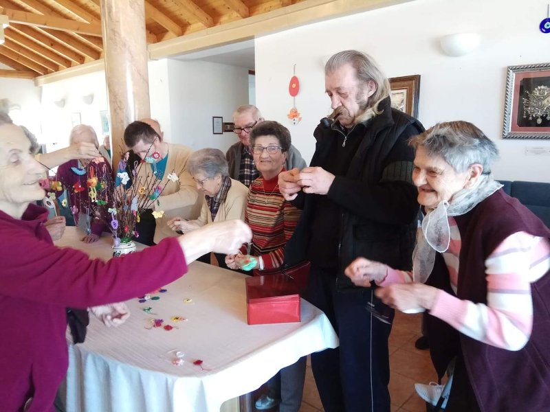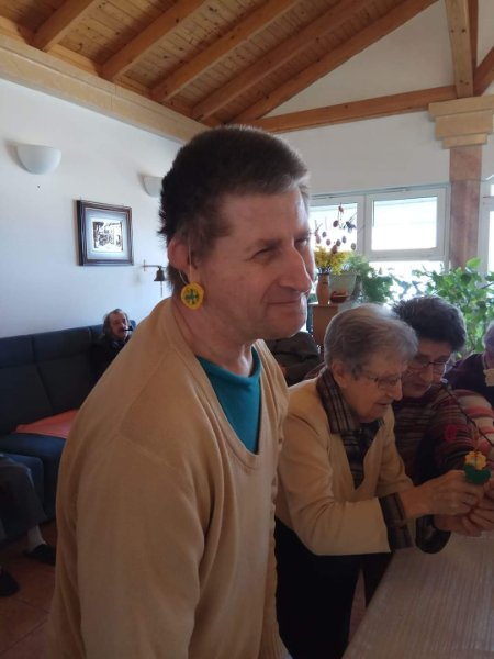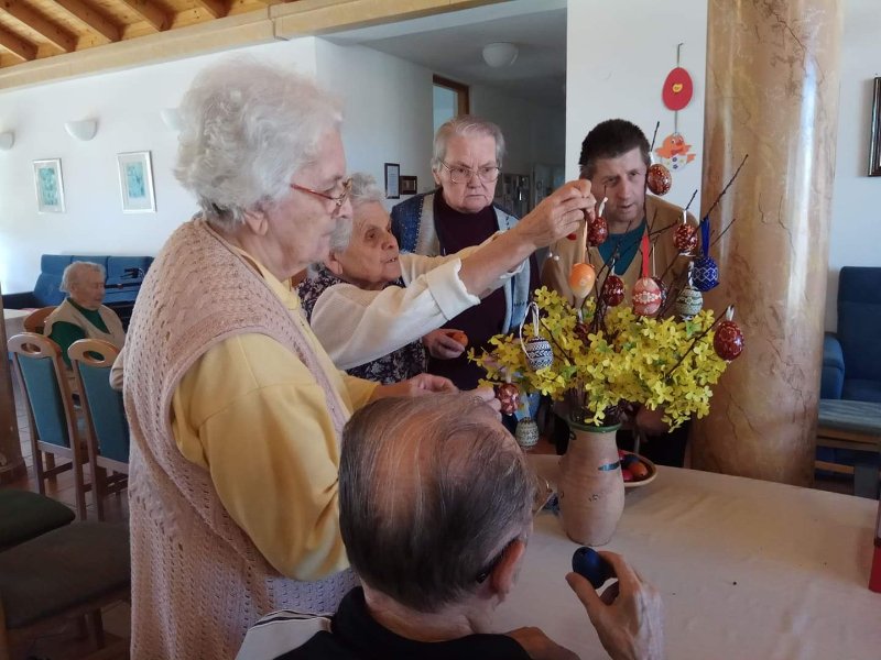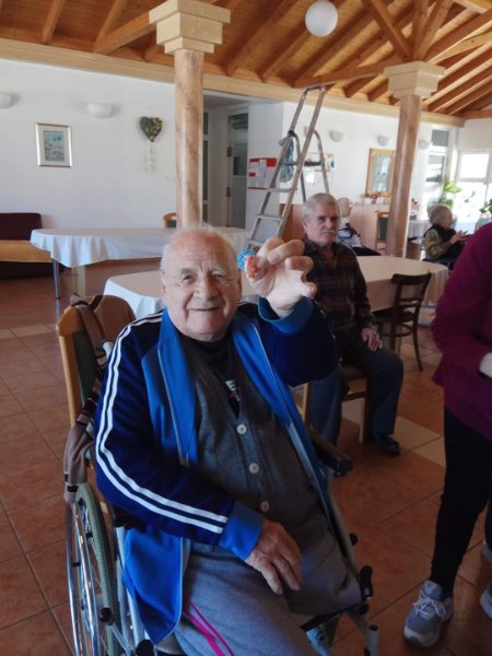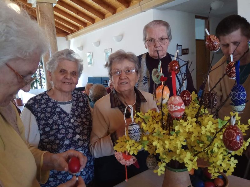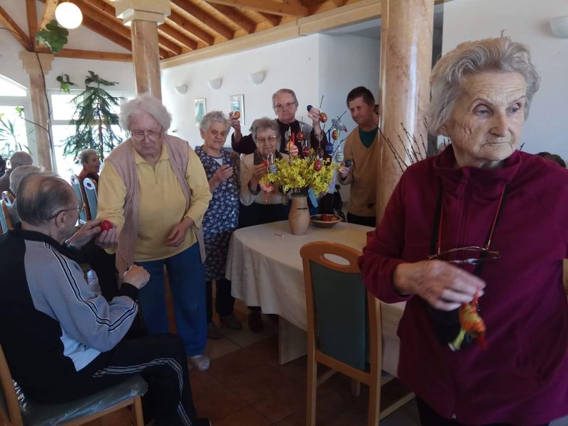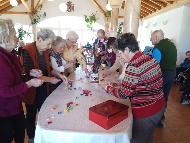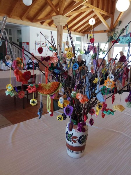 A férfiak locsoló verseket tanulnak. Az első áprilisi foglalkozáson előszedtük az előző évi és az újonnan készült kézimunkákat. Valamennyi lakó segítségével kidekoráltuk a közös tereket. Szép tojásfát készítettünk és egy másik nagy vázába tavaszt varázsoltunk. Az ágakra horgolt pillangókat, virágokat és szerencsehozó madarakat raktunk. A porta pultjára kihelyeztük, habár napjainkban a járvány miatt nálunk is látogatási tilalom van. Úgy gondoljuk, ha már kint rideg idő van, itt a házon belül legalább sikerült vidám tavaszi hangulatot varázsolnunk. Az intézmény falai között biztonságban érezzük magunkat, hiszen a vezetőség és az összes dolgozó vigyáz ránk. Köszönjük!!!