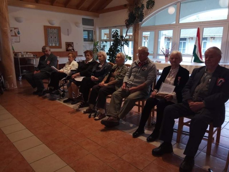 De most elmondhattam, hogy mit kíván a Magyar Nemzet. Az olvasás eddig nem jelentett problémát, de hangsúlyozva, mikrofonba mondva ez volt az első eset. Megtiszteltetésnek vettem a megbízást, már szobánkban elkezdtük a próbát. Kezdetben nehezen jött a nyelvemre pár szó, mint Bulyovszky, meg a proklamáció. De a gyakorlat teszi a mestert, mire kellett, e szavak is mentek. Zsuzsa nővér vezényletével intézetünk aulájába 8 ápolt bottal, mankóval és kerekes székkel felsorakozott, kokárdával szívünk felett szerepeltünk. A RÁNK BÍZOTT FELADATOT MINDANNYIAN TELJESÍTETTÜK! Ez volt a tűzkeresztségem. Főleg a bátorságomra vagyok büszke. Ugyanis korábban ilyesmit csak csendben, kívülről szemléltem. Ennyi évet kellett megélnem, hogy a közért nyilvánosan valamit tegyek.