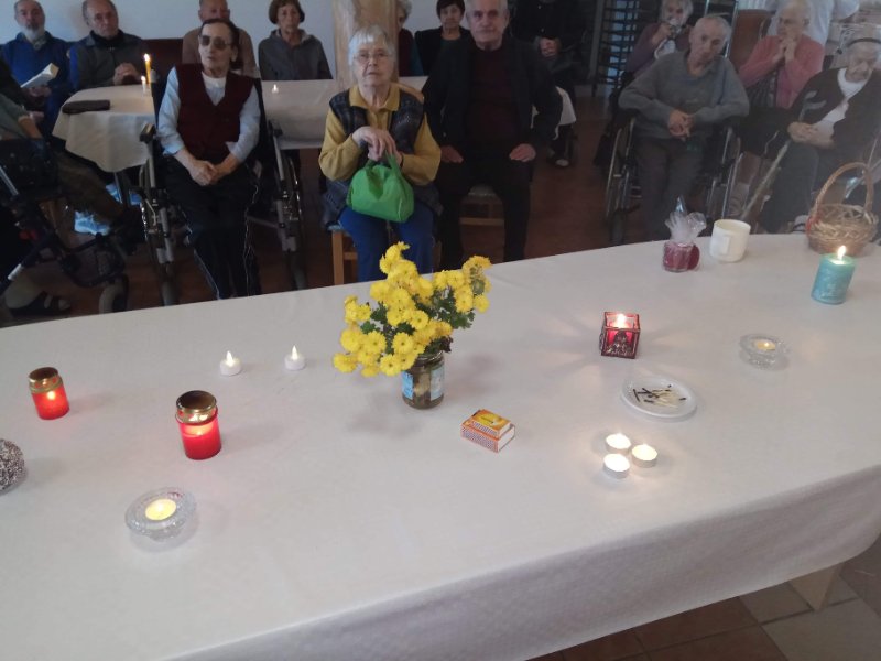 A Koppányvölgye Idősek Otthonában megemlékeztünk e jeles egyházi ünnepekről. Lakóink számára igen fontos, hogy méltóképp felidézhessék elhunyt hozzátartozóik emlékét, hiszen sokan közülük nem tudnak már személyesen eljutni a temetőkbe, hogy leróják kegyeletüket szeretett halottaik előtt. Számukra különösen fontos, hogy bensőséges, megható megemlékezés keretében felidézzük szeretteik életét, cselekedeteit, kegyelettel megemlékezzünk róluk. A mai délelőtt könnyeket csalt minden jelenlévő szemébe.