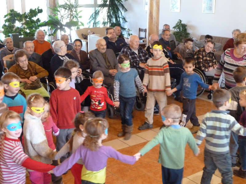A törökkoppányi óvodások is részt vettek a mulatságban, örömmel vették a lakóink által készített kis álarcokat. Meglepetésként az ápolók készültek egy kis paródiával, melyben az otthon életéből merítettek humoros fordulatokat. Jól éreztük magunkat ezen a délelőttön, a farsangi fánk idén is mind egy szálig elfogyott!