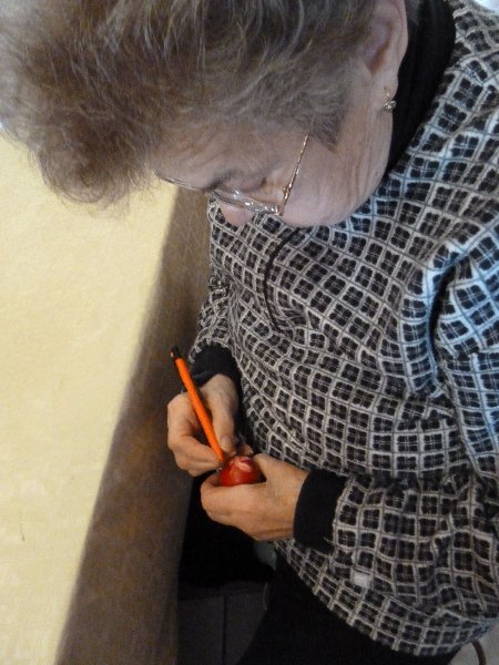 Az utóbbi években többször tartottak előadást, foglalkozást gyerekeknek, de nálunk, az idősek otthonában is jártak már. Idén, a húsvét előtti készülődést használtuk ki, hogy az idős, nem törökkoppányi emberek is megismerjék az értékes, hagyományos karcolásos technikát.